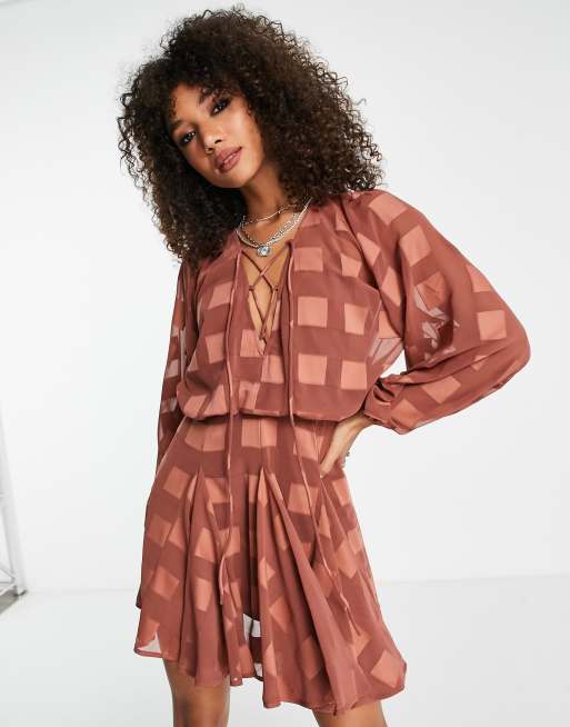 Asos Design Plunge Mini Dress With Godet Skirt In Brown Jacquard Asos